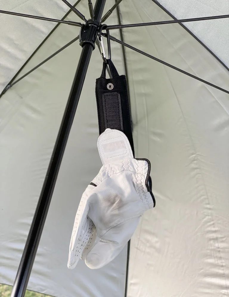 Portable Glove Mount clipped to the undersurface of an umbrella for playing in the rain.
