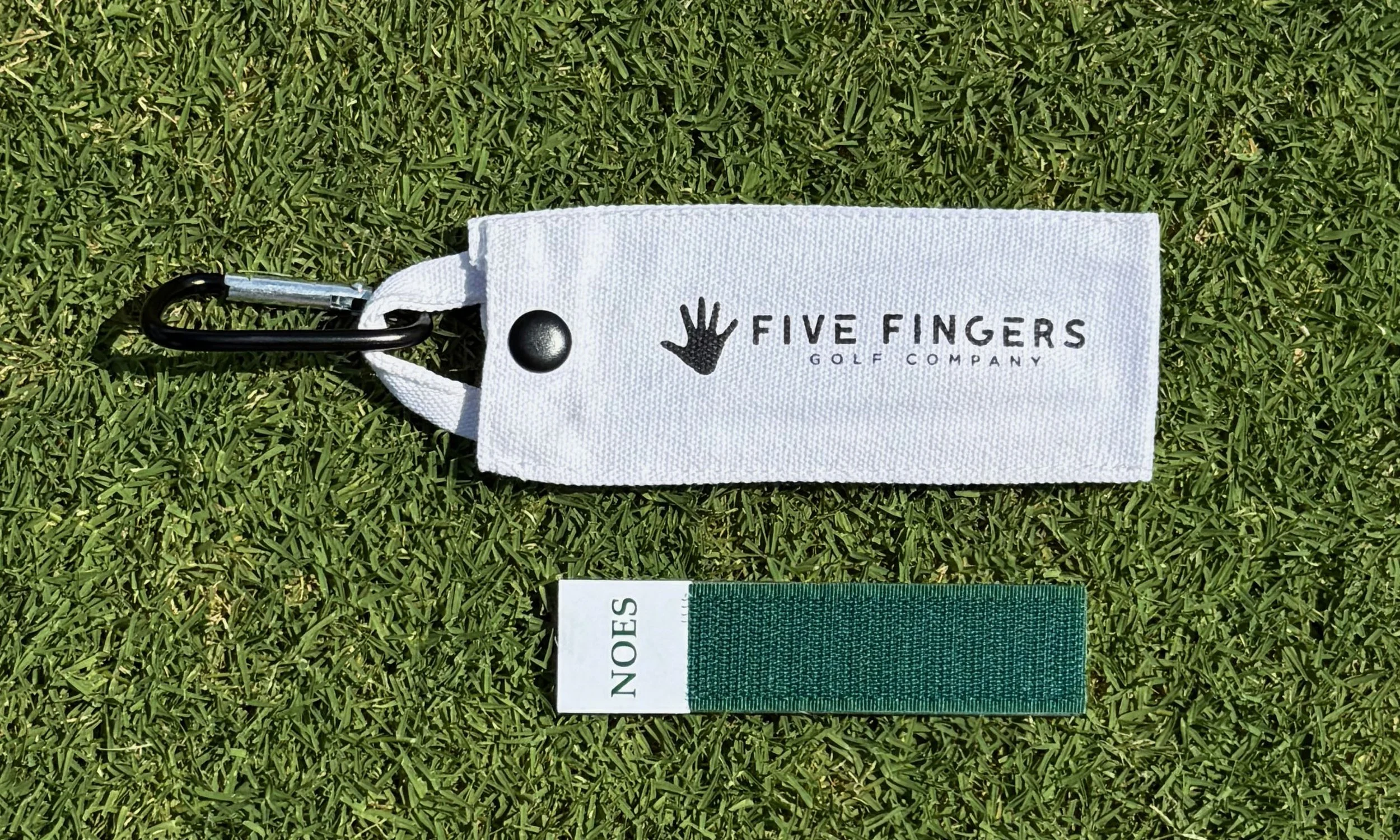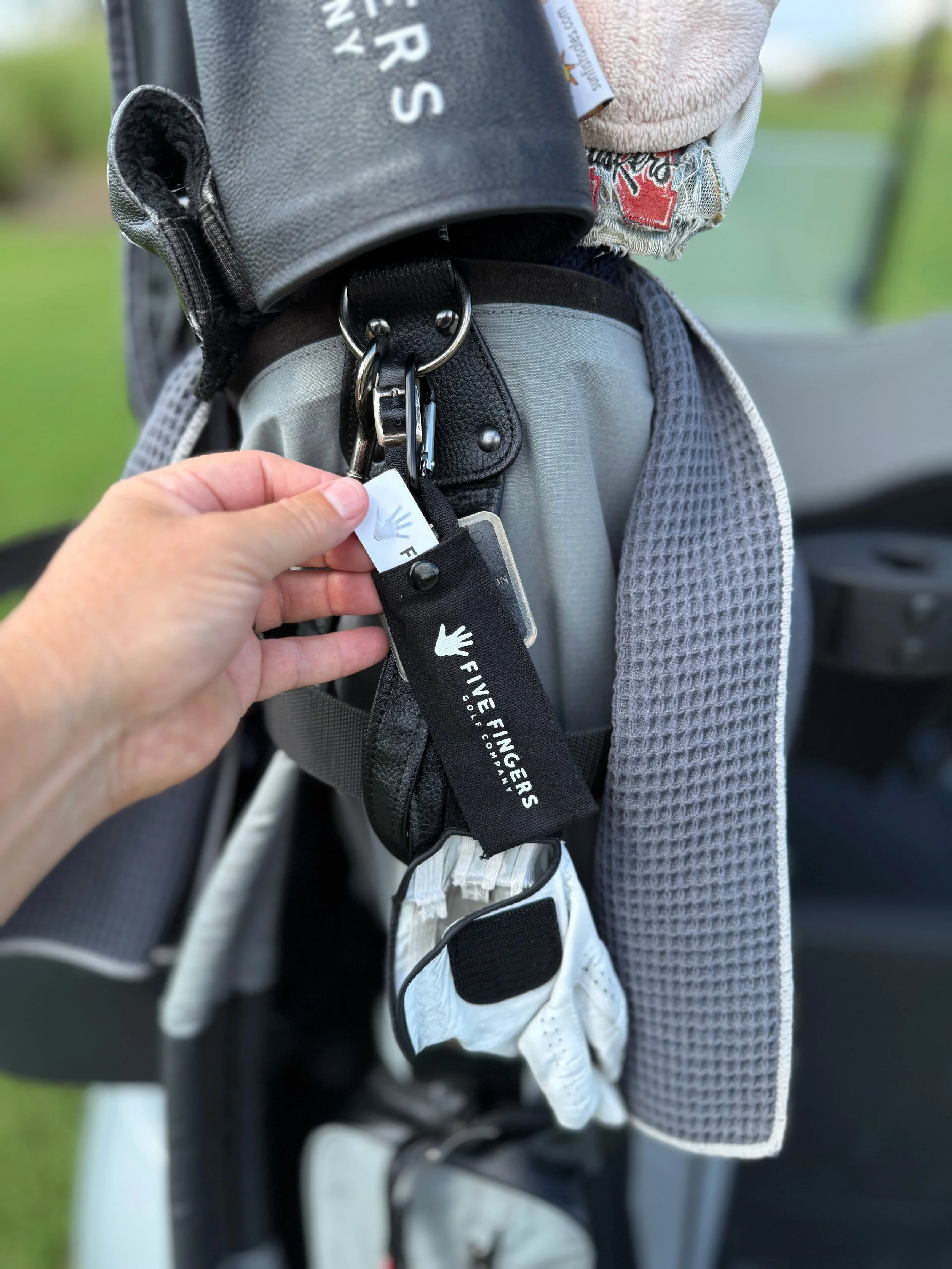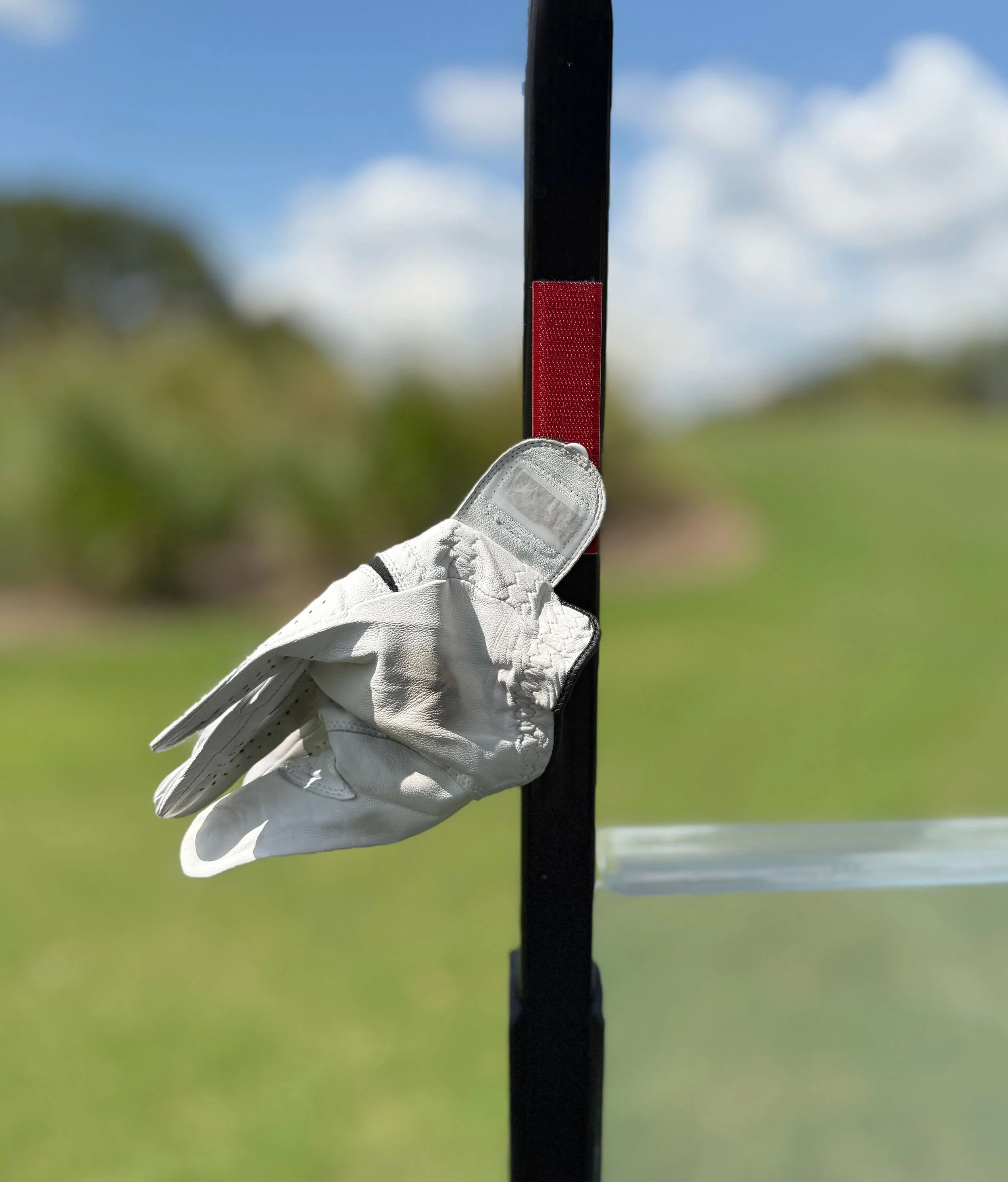 Portable Glove Mount clipped to the exterior of a golf bag.